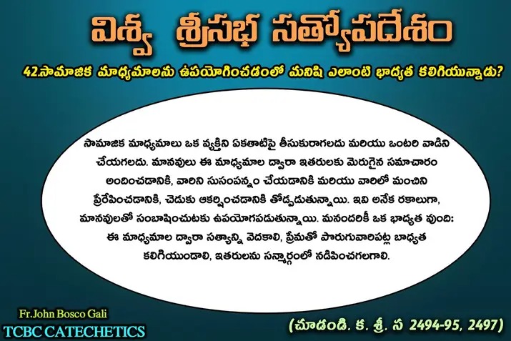 సామాజిక మాధ్యమాలు ఒక వ్యక్తిని ఏకతాటిపై తీసుకురాగలదు మరియు ఒంటరి వాడిని చేయగలదు. మానవులు ఈ మాధ్యమాల ద్వారా ఇతరులకు మెరుగైన సమాచారం అందించడానికి,వారిని సుసంపన్నం చేయడానికి మరియు వారిలో మంచిని ప్రేరేపించడానికి,చెడుకు ఆకర్షించడానికి తోడ్పడుతున్నాయి.ఇవి అనేక రకాలుగా, మానవులతో సంబాషించుటకు ఉపయోగపడుతున్నాయి. మనందరికీ ఒక భాద్యత వుంది:ఈ మాధ్యమాల ద్వారా సత్యాన్ని వెదకాలి,ప్రేమతో పొరుగువారిపట్ల బాధ్యత కలిగియుండాలి,ఇతరులను సన్మార్గంలో నడిపించగలగాలి.