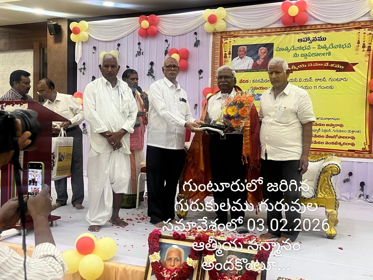 "ఆచార్య దేవోభవ –పితృ దేవోభవ" అంటూ ఆంధ్రప్రదేశ్ గురుకులాల్లో డిప్యూటీ సెక్రటరీగా పని చేసి,పదవీ విరమణ చేసిన శ్రీ అప్పారావు గారు పండితులైన ముగ్గురికి సన్మానం చేయాలని సంకల్పించారు.వారిలో మన భారతమిత్రం రచయిత కవి,ఆంధ్రోపన్యాసకులు శ్రీ డా.కల్లూరి ఆనందరావు గారిని గుంటూరు కనక మేడల కన్వెన్షన్ హాలులో 03.02.2026 తేదీన ఘనంగా సత్కరించారు.ఈ కార్యక్రమానికి ప్రముఖ రాజకీయ నాయకురాలు శ్రీమతి నన్నపనేని రాజకుమారి గారు ఆత్మీయ అతిథిగా హాజరయ్యారు.డాక్టర్ కల్లూరి ఆనందరావు గారు మన భారతమిత్రం పత్రిక ద్వారా సమాజాన్ని మేల్కొలిపే రచనలు,పద్యాలతో విశేష సేవలందించారు.ఆనందరావు గారు తన పుస్తక రచనల ద్వారా సామాజిక చైతన్యానికి బాటలు వేశారు.ఇలాంటి మరెన్నో అర్థవంతమైన సాహిత్య సేవలు కొనసాగించాలని భారతమిత్రం యాజమాన్యం శుభాకాంక్షలు తెలియపరుస్తున్నది.